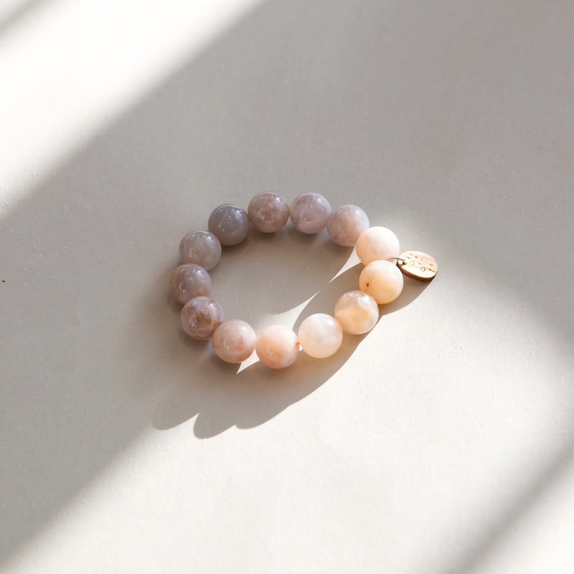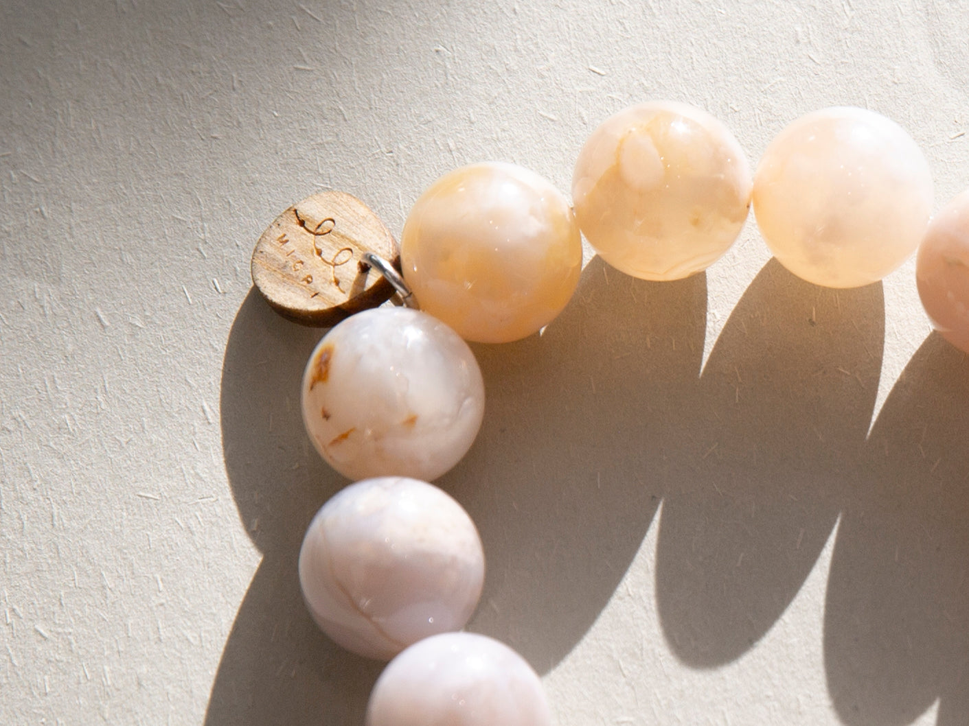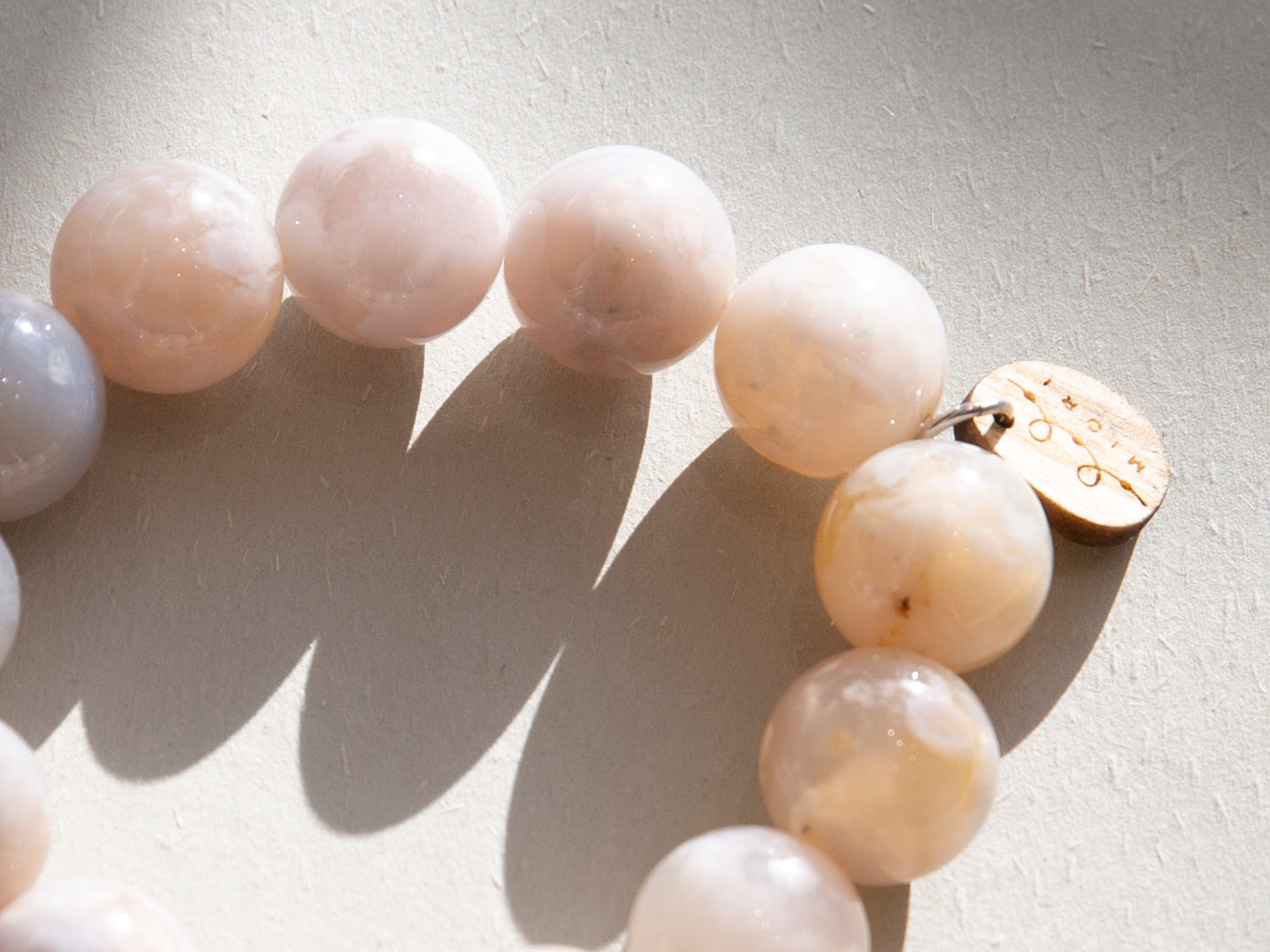 With soft pink and milky white blending together, this Sakura Agate bracelet seems to capture the very essence of spring.
